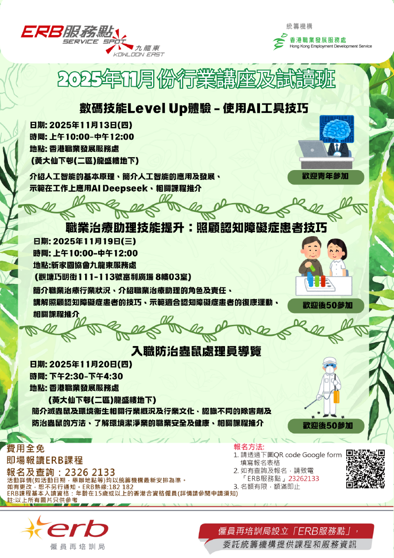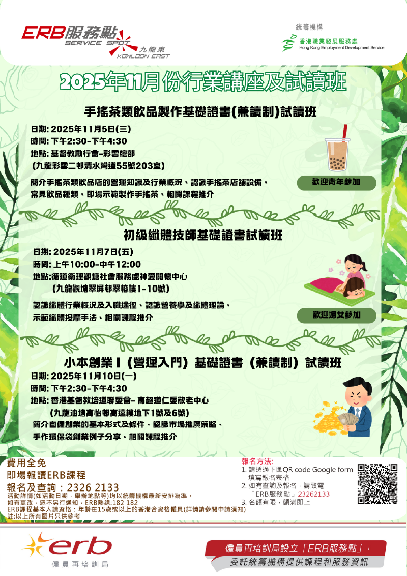 |  | 本處獲僱員再培訓局委任為「ERB服務點(九龍東)」統籌機構,與地區組織協作設立「ERB服務點」,為區內人士提供查詢及報讀課程服務、舉辦行業講座及試讀班,及預約培訓顧問服務等。每個服務點均有統籌機構的職員定期當值,為市民提供服務。 ERB服務點(九龍東)介紹及地址: < 請按此>