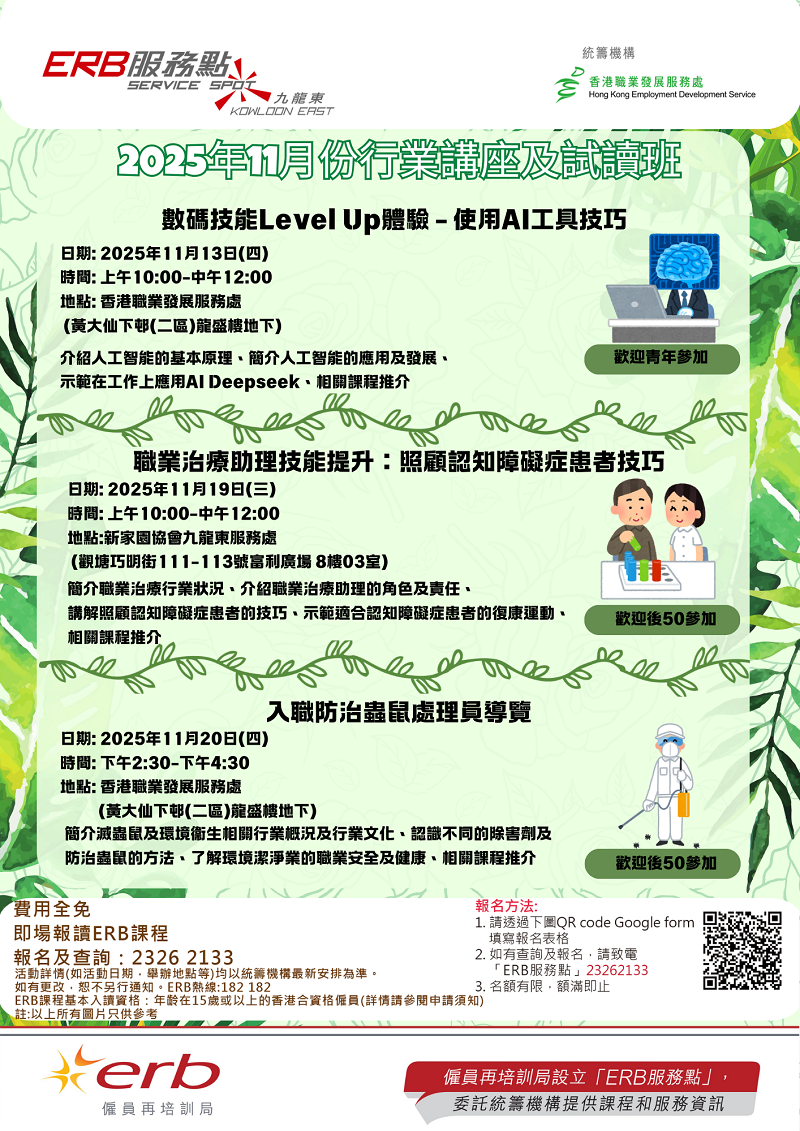 本處獲僱員再培訓局委任為「ERB服務點(九龍東)」統籌機構,與地區組織協作設立「ERB服務點」,為區內人士提供查詢及報讀課程服務、舉辦行業講座及試讀班,及預約培訓顧問服務等。每個服務點均有統籌機構的職員定期當值,為市民提供服務。 ERB服務點(九龍東)介紹及地址: < 請按此>