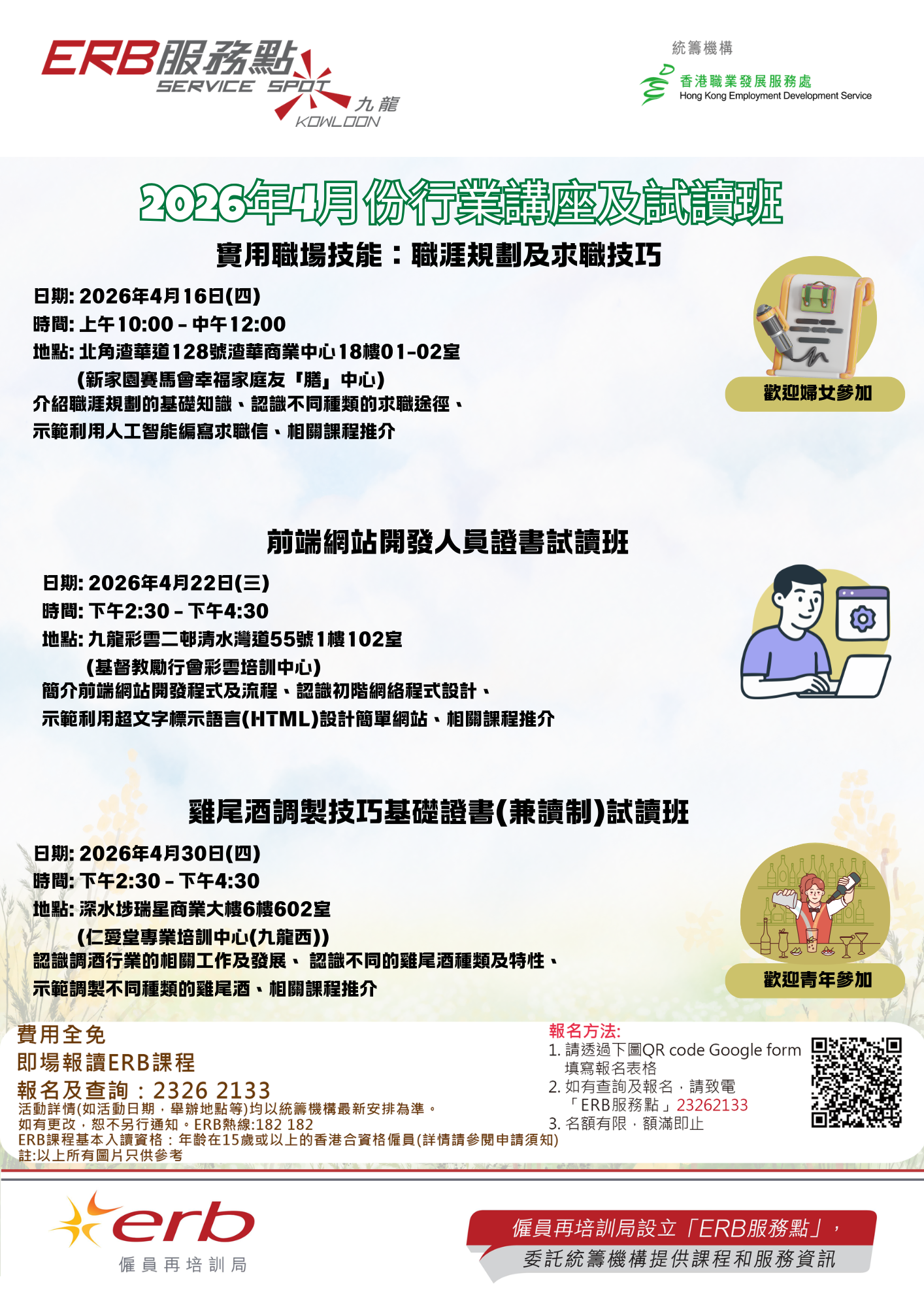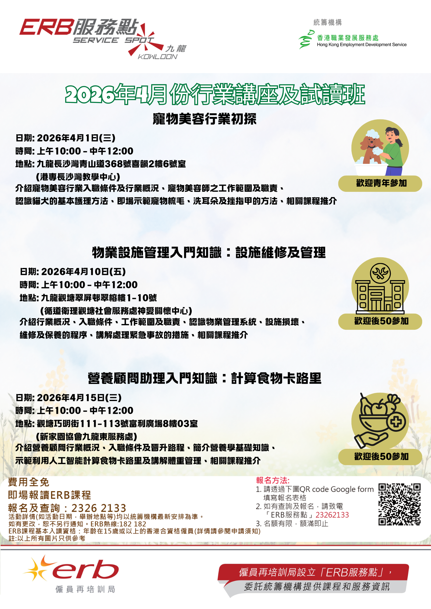 本處獲僱員再培訓局委任為「ERB服務點(九龍)」統籌機構,與地區組織協作設立「ERB服務點」,為區內人士提供查詢及報讀課程服務、舉辦行業講座及試讀班,及預約培訓顧問服務等。每個服務點均有統籌機構的職員定期當值,為市民提供服務。