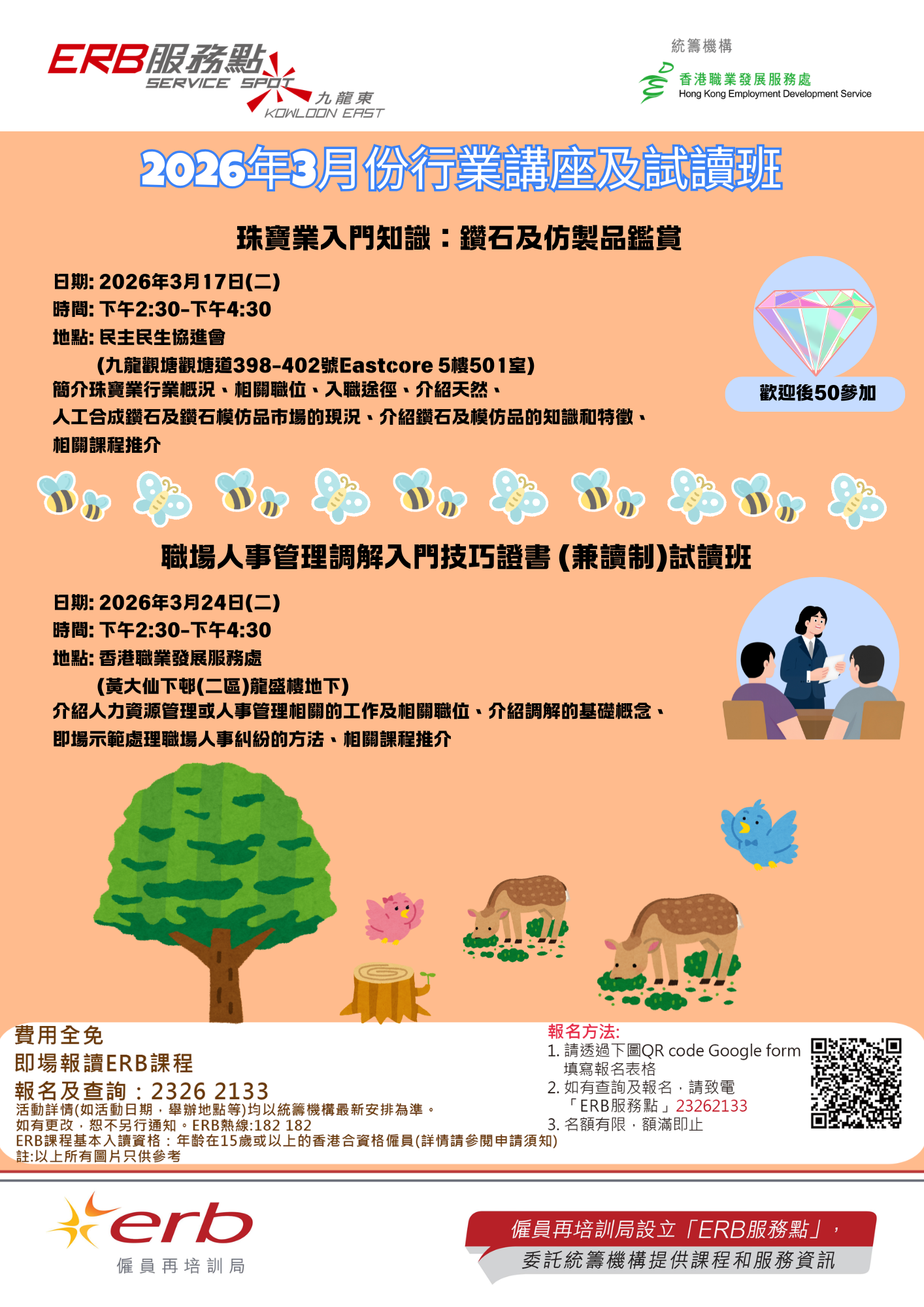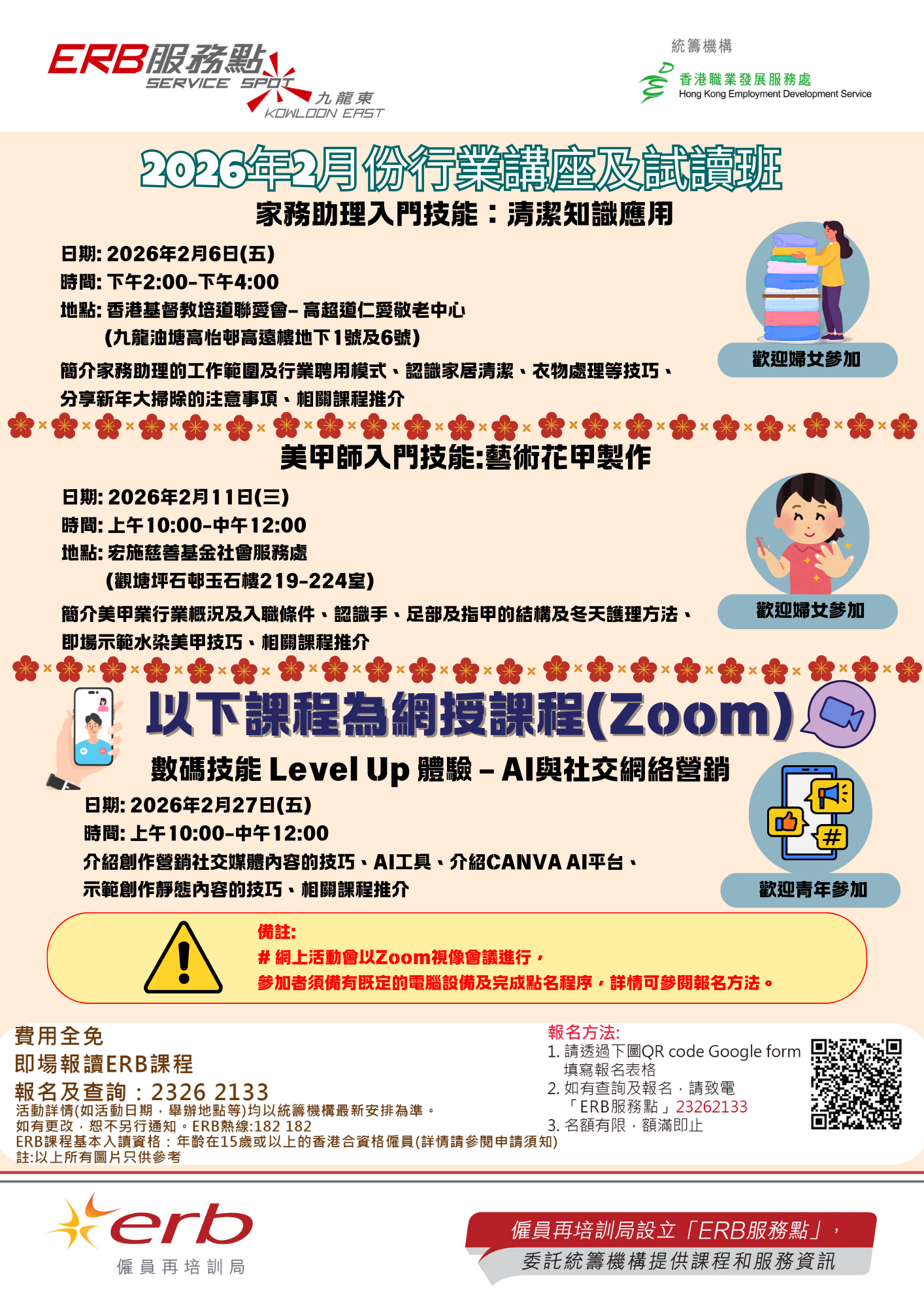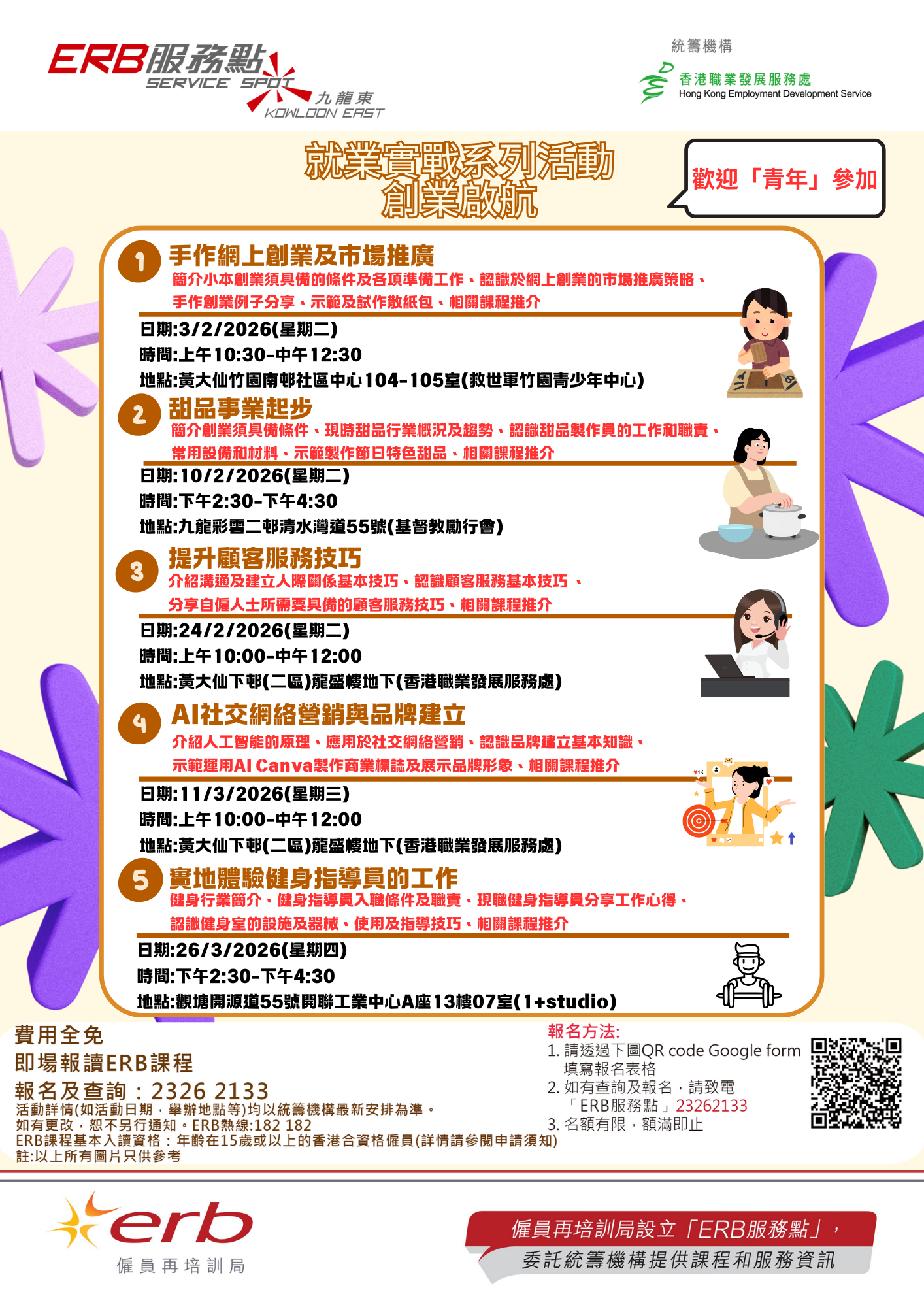 本處獲僱員再培訓局委任為「ERB服務點(九龍東)」統籌機構,與地區組織協作設立「ERB服務點」,為區內人士提供查詢及報讀課程服務、舉辦行業講座及試讀班,及預約培訓顧問服務等。每個服務點均有統籌機構的職員定期當值,為市民提供服務。